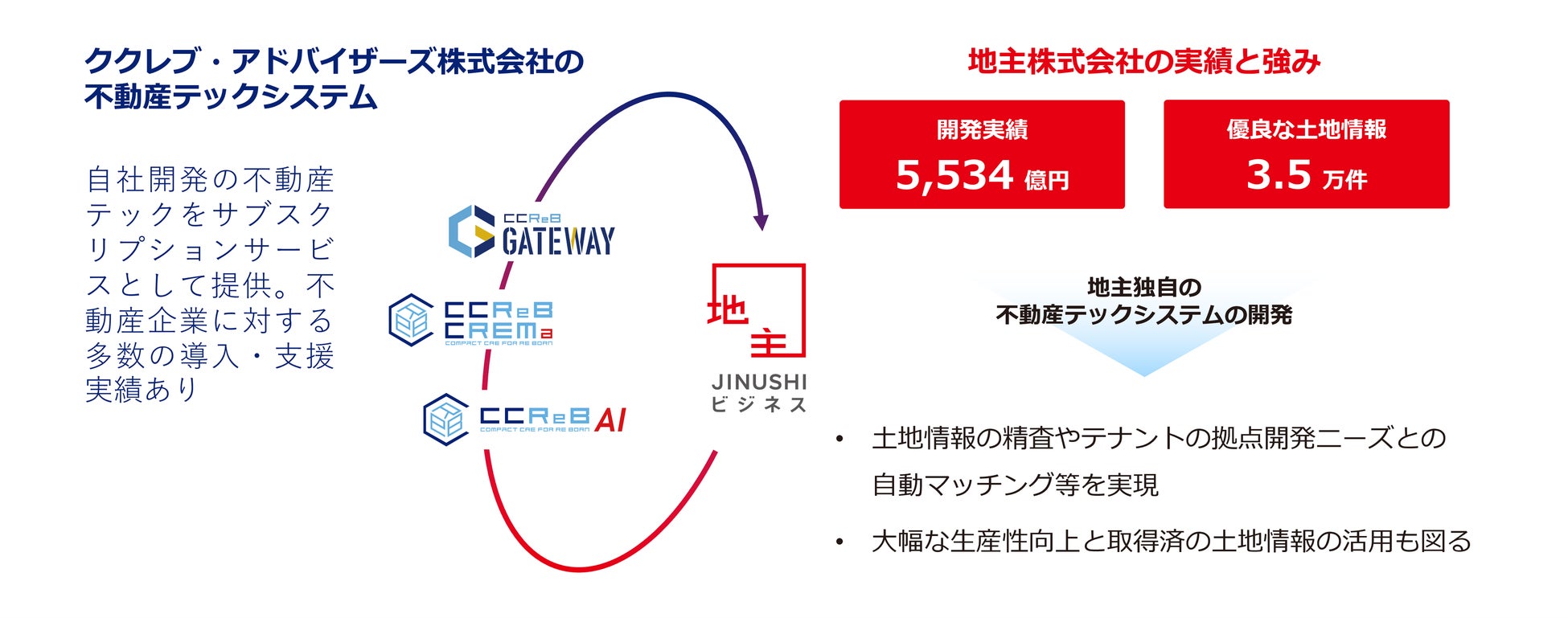 当社は、ククレブ社のCRE領域のノウハウを活用し仕入拡大につなげるとともに、ククレブ社は、JINUSHIビジネスによる土地のオフバランス提案を通じて、CREソリューション事業で顧客企業の多様なニーズに対応いたします。