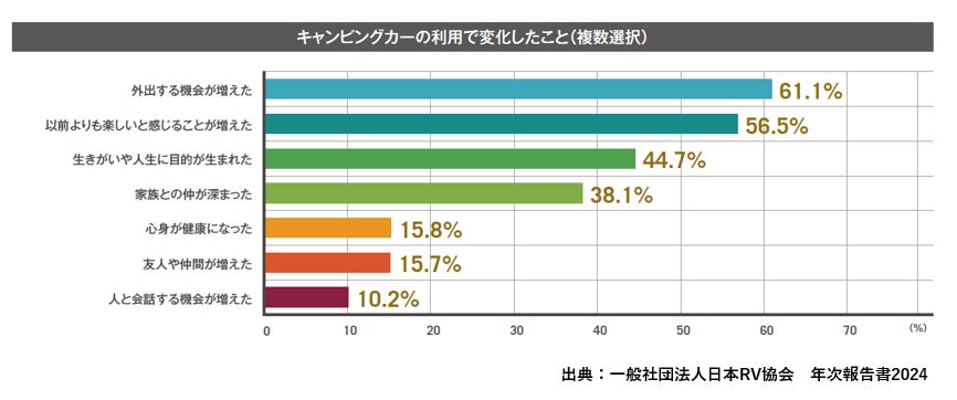 キャンピングカーの利用での変化について、外出する機会が増えたと答えたオーナーが最も多い結果となりました。キャンピングカーがあることで、外出や旅行のハードルが下がり、よりアクティブな行動をとるようになっていることが分かります。その結果、楽しいと感じることが増えたり、生きがいや人生の目的が生まれたと感じる人も多いと考えられます。キャンピングカーを手に入れたことで、行動パターンに変化が起こり、精神的な安定も得られているオーナーの姿をアンケートから垣間見ることができます。