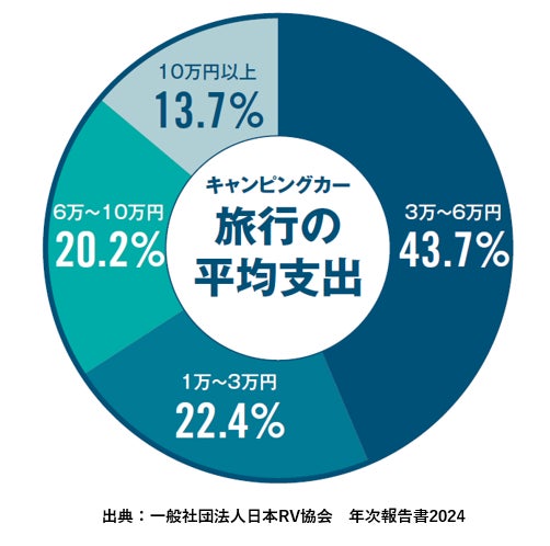 キャンピングカーで旅行する際の平均支出を調査したところ、3~6万円が最も多く、全体の43.7%を占めています。次に多いのが1~3万円、そして6~10万円の20.2%と続きます。宿泊費が抑えられることから、キャンピングカー旅行では消費のほとんどが観光や食事にあてられると考えられます。