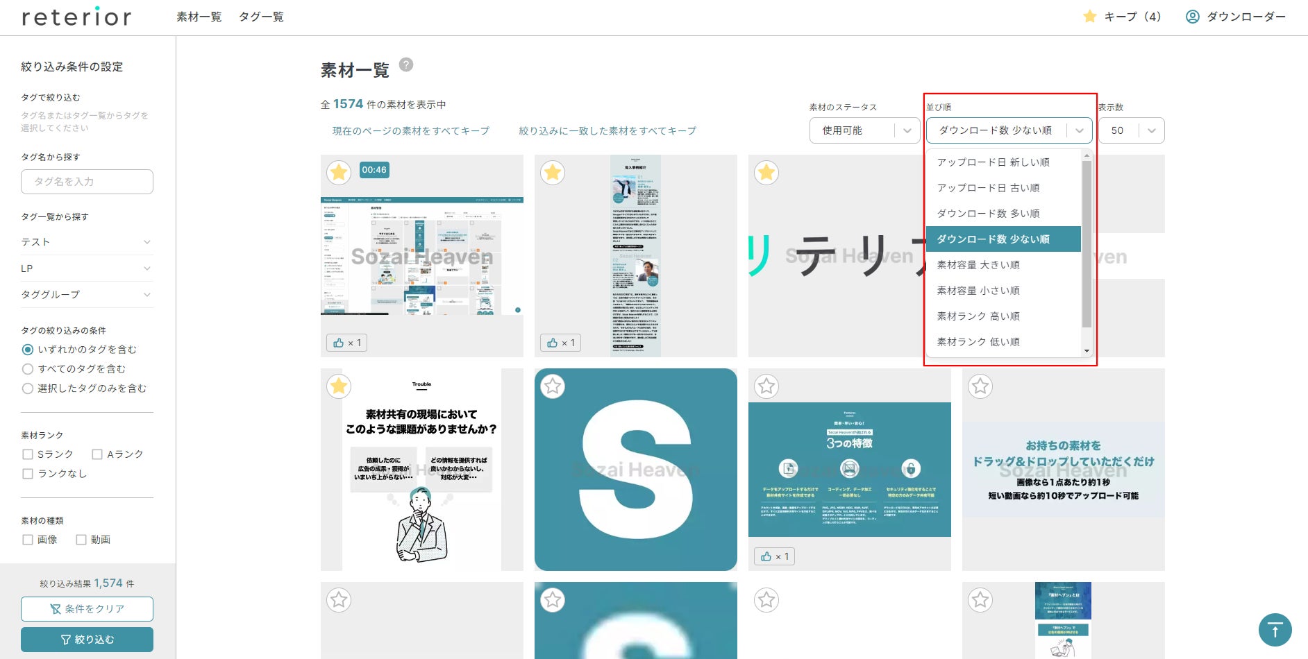 ITスタートアップ企業 株式会社リテリア(本社:東京都世田谷区 代表取締役:西川信行)は、オンラインマーケティング支援ツールである「素材ヘブン」の、新機能「素材の並び替え機能」をリリースしました。素材の並び替え機能とは、ダウンロード数やいいね数等の様々な条件で素材を並び替える機能です。