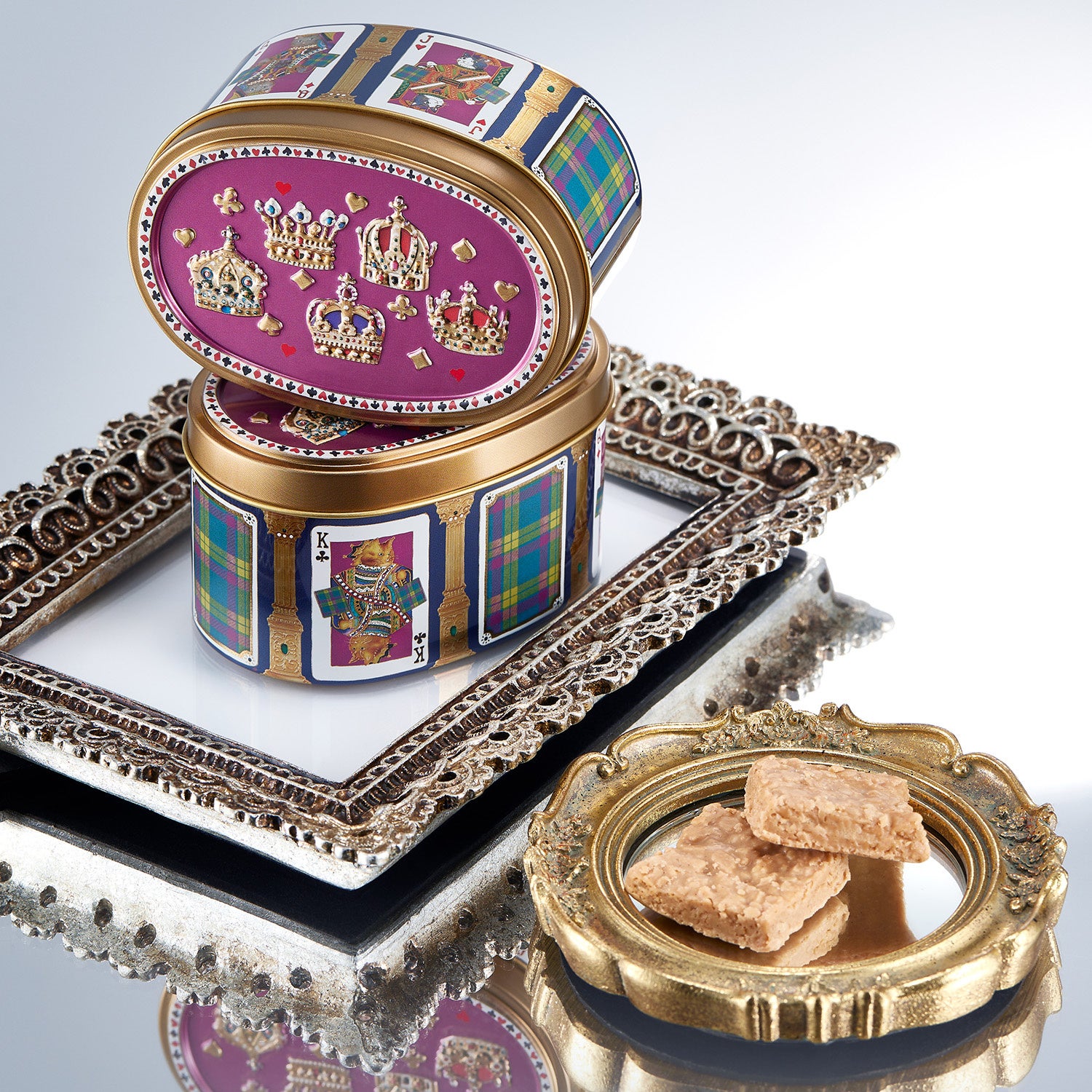 伊勢丹といえば、紙袋でもお馴染みのマクミラン柄。缶の側面にマクミラン柄のトランプをデザインしました。蓋面の王冠デザインの背景色は、伊勢丹の紙袋の取っ手の色をイメージしました。