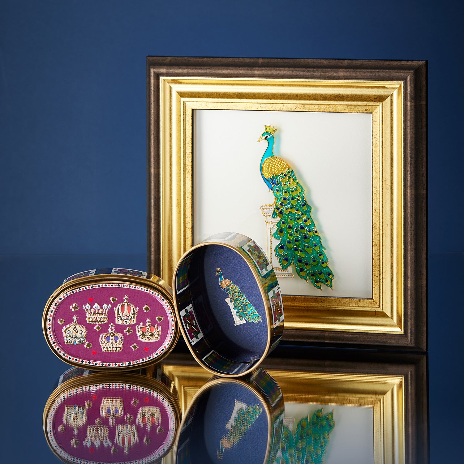 缶内側の底面には、伊勢丹新宿店本館の正面玄関レリーフにも描かれており、伊勢丹のシンボルである『孔雀』をイメージしたガラス絵を施しました。伊勢丹ファン必見の隠し味です。