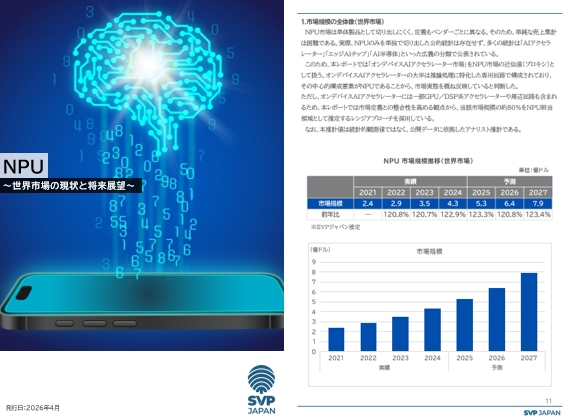 会員制マーケットリサーチサービスを提供している、株式会社SVPジャパン(本社:東京都中央区、代表取締役社長:橋本 雅、以下「SVPジャパン」)は、本日、SVP注目市場分析レポート「NPU-世界市場の現状と将来展望-」を、会員企業向けに公開いたしました。