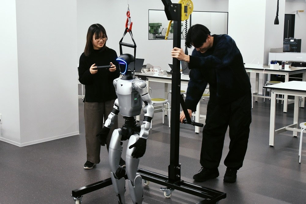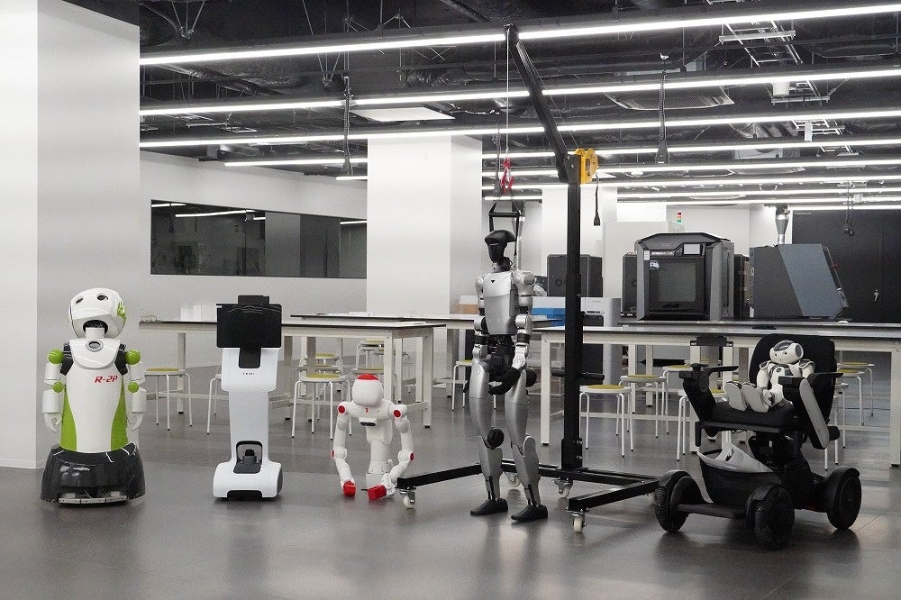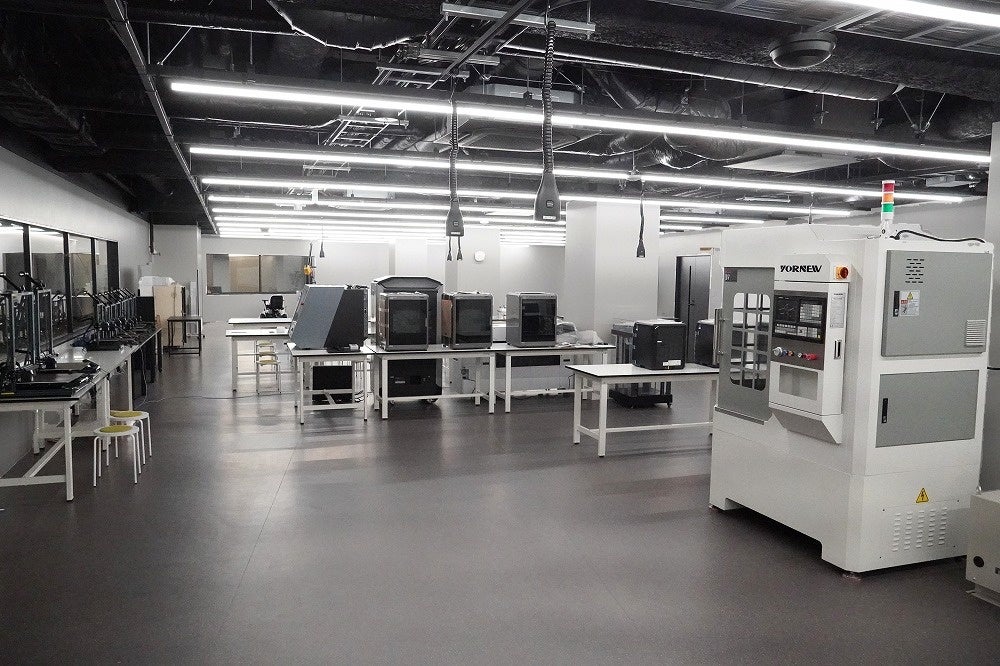 学部・学科を問わず全学生が利用可能。室内には、3Dプリンターやレーザーカッターなどの最新設備のほか、ボール盤やフライス盤といったものづくりの基本となる工作機械を整備しています。4足歩行ロボットや移動搬送ロボットも配置し、動作実験を行うためのスペースも完備しています。