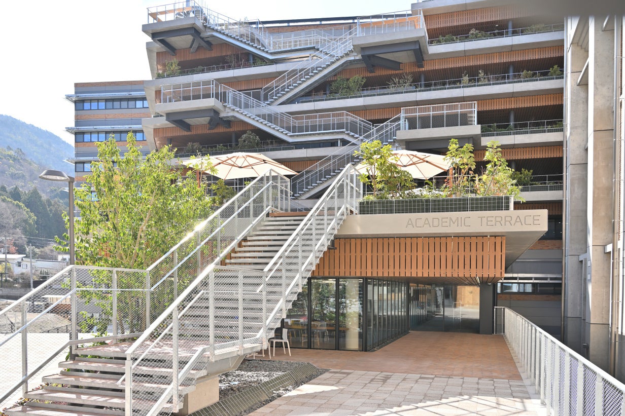 新棟「アカデミックテラス」は自然と調和し、多様な交流を生み出す、情報・AI・医療のオープンイノベーション拠点です。医療と工学の最先端を学ぶ教育・研究設備を擁するとともに、地面から最上階まで屋外階段とテラスが続く外観が特徴です。