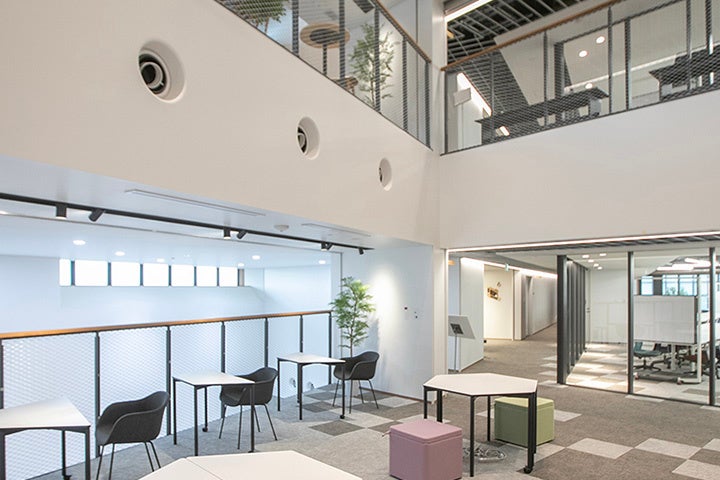 また、各階のコモンズを吹き抜け(スパイン)でつなげ、上下フロアの活動を感じながら、学際的連携を生み出す空間づくりとしています。