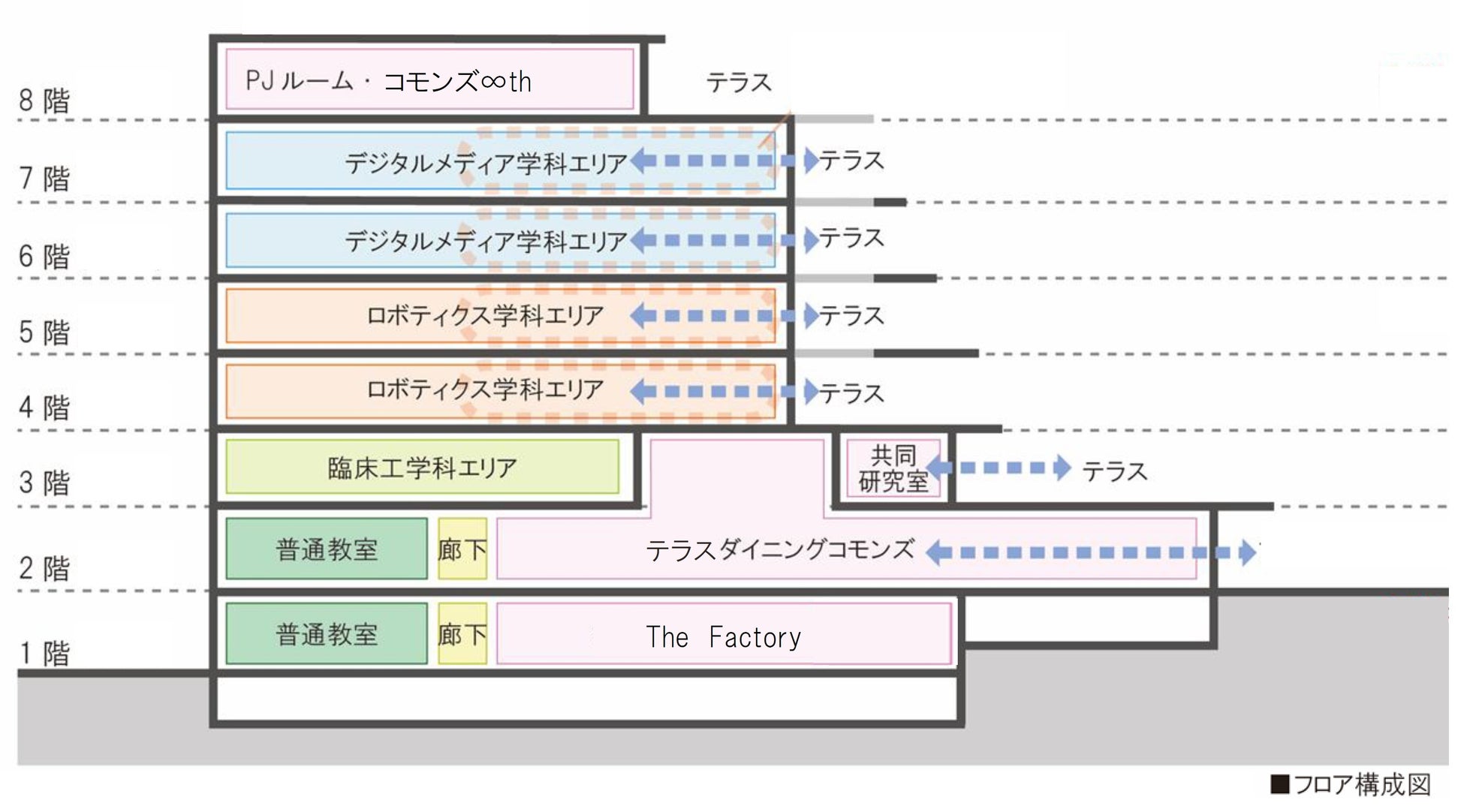 アカデミックテラスは、2026年4月に新しく開設したデジタルメディア学部、工学部ロボティクス学科、健康科学部臨床工学科の教育・研究拠点であり、地上8階建、延床面積は約13,000㎡と本学最大の建物となります。学生・教職員だけでなく地域の方々を含む多様な人々が集い、交流し、活動するアクティビティの拠点となることを目指しています。
