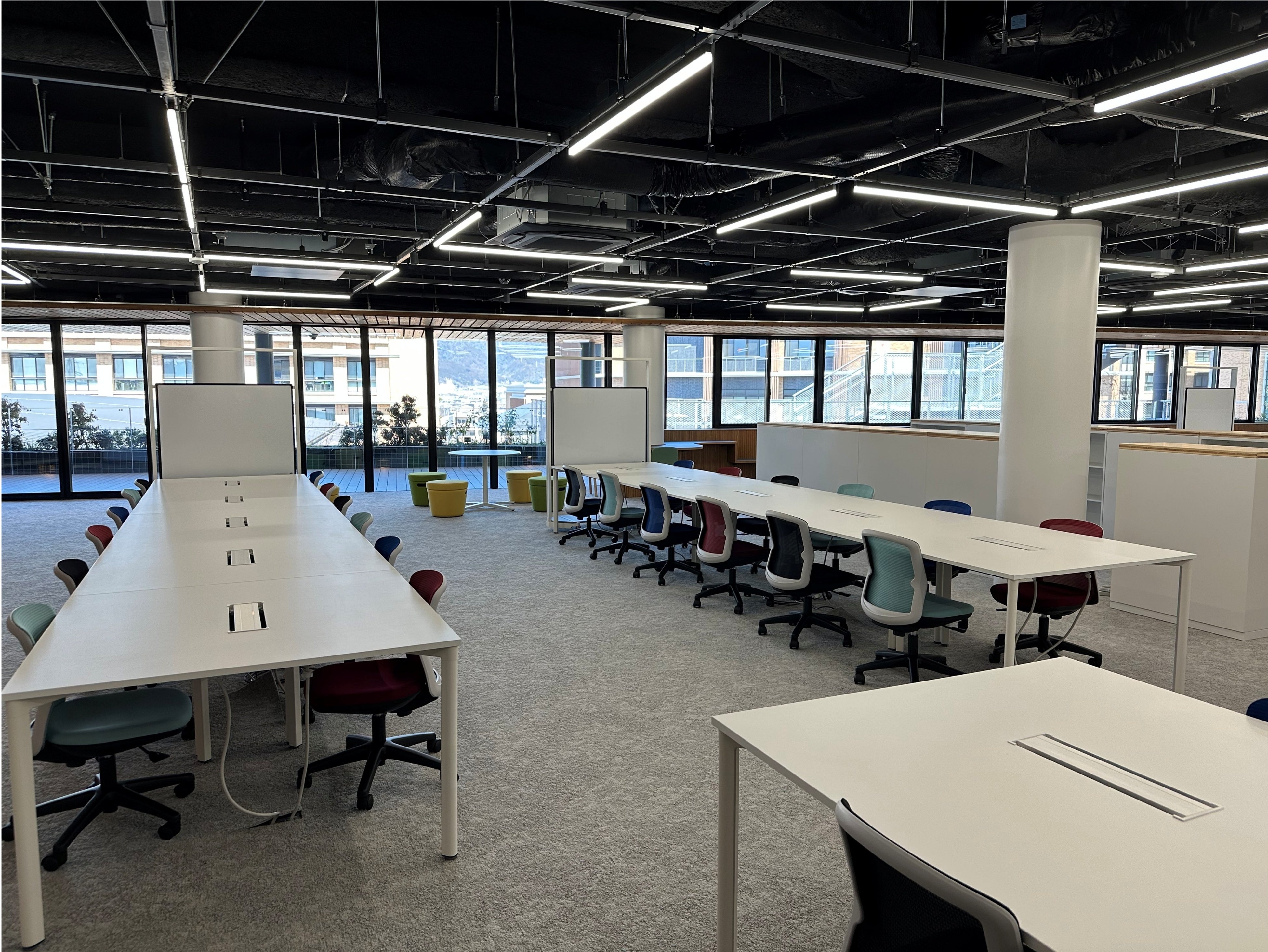 学生だけの閉ざされた空間ではなく、社会にも開かれた少し特別感のある場所として計画し、学内外の人が集まり、交流し、新しい価値を生み出す「未来価値創造の舞台」となることを目指しています。この空間には、移動しやすい椅子や家具を配置し、用途に応じて可変的な活用ができるよう工夫をしています。
