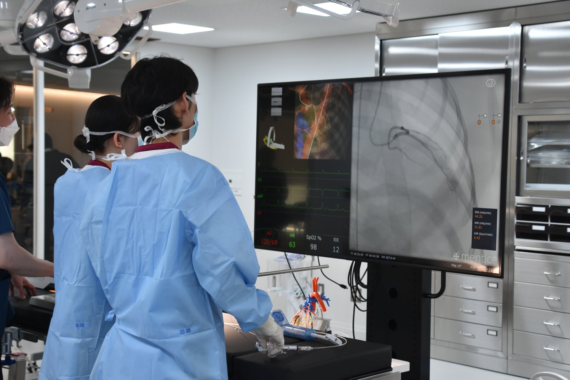 手術支援ロボット操作に関する業務や、関西の臨床工学技士養成校では初導入となる、VR血管内シミュレータ「Mentice VIST G7」を使用した心臓カテーテル治療、高度医療機器の操作をはじめ、術野を確認し医師に鋼製小物を手渡しする直接介助業務などを学びます。