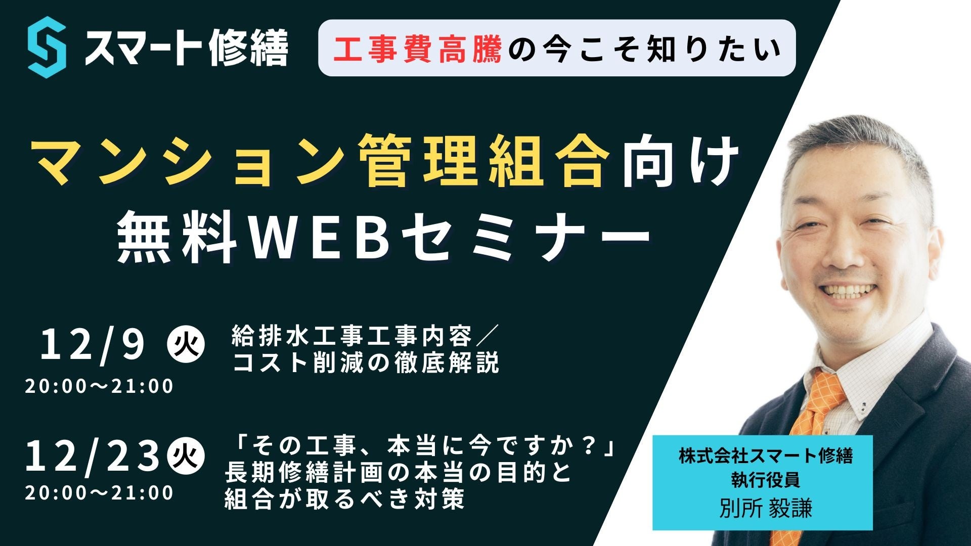 マンションやビルなど大型建物の修繕工事の見積、工事支援サービスを展開する株式会社スマート修繕(本社:東京都港区)は、マンション区分所有者様を対象にした無料のWebセミナーを開催します。