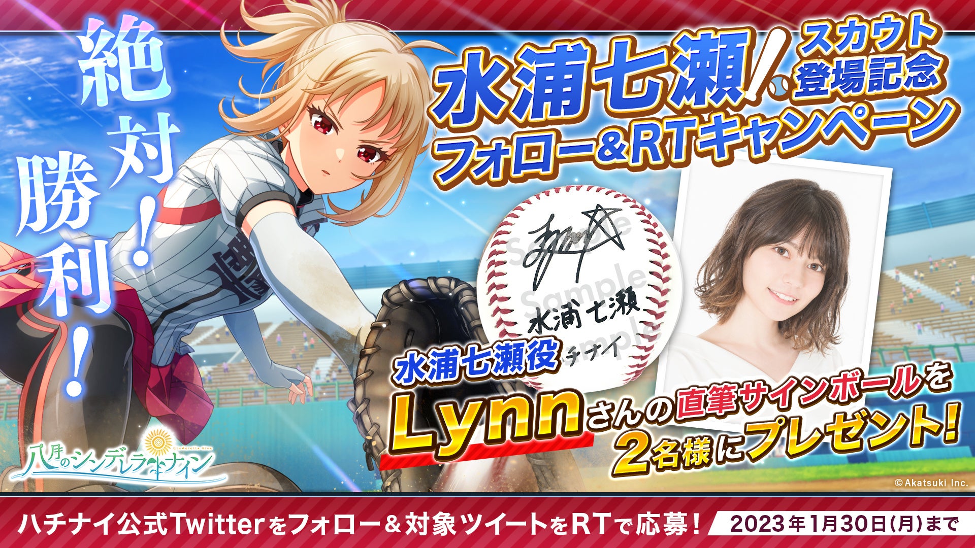 株式会社アカツキゲームス(本社:東京都品川区、代表取締役:戸塚佑貴、株式会社アカツキ100%子会社)は、当社より好評配信中のiOS/Android用アプリ『八月のシンデレラナイン(略称:ハチナイ)』において、2023年1月26日(木)より、Lynnさんが演じるキャラクター、帝陽学園の「水浦七瀬」が初登場することをお知らせいたします。またLynnさん演じる水浦七瀬の初登場を記念して直筆サインボールがもらえるTwitterキャンペーンを開催いたします。