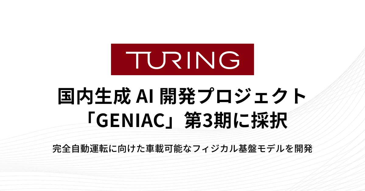 Turing株式会社(東京都品川区、代表取締役:山本 一成、以下「チューリング」)は、経済産業省および国立研究開発法人新エネルギー・産業技術総合開発機構(以下「NEDO」)が実施する、国内の生成AIの開発力強化を目的としたプロジェクト「GENIAC」の第3期に採択されたことをお知らせします。これにより、GPU計算資源の活用およびデータセット構築のための事業に対して助成を受け、完全自動運転に向けた車載可能なフィジカル基盤モデルの開発を推進します。
