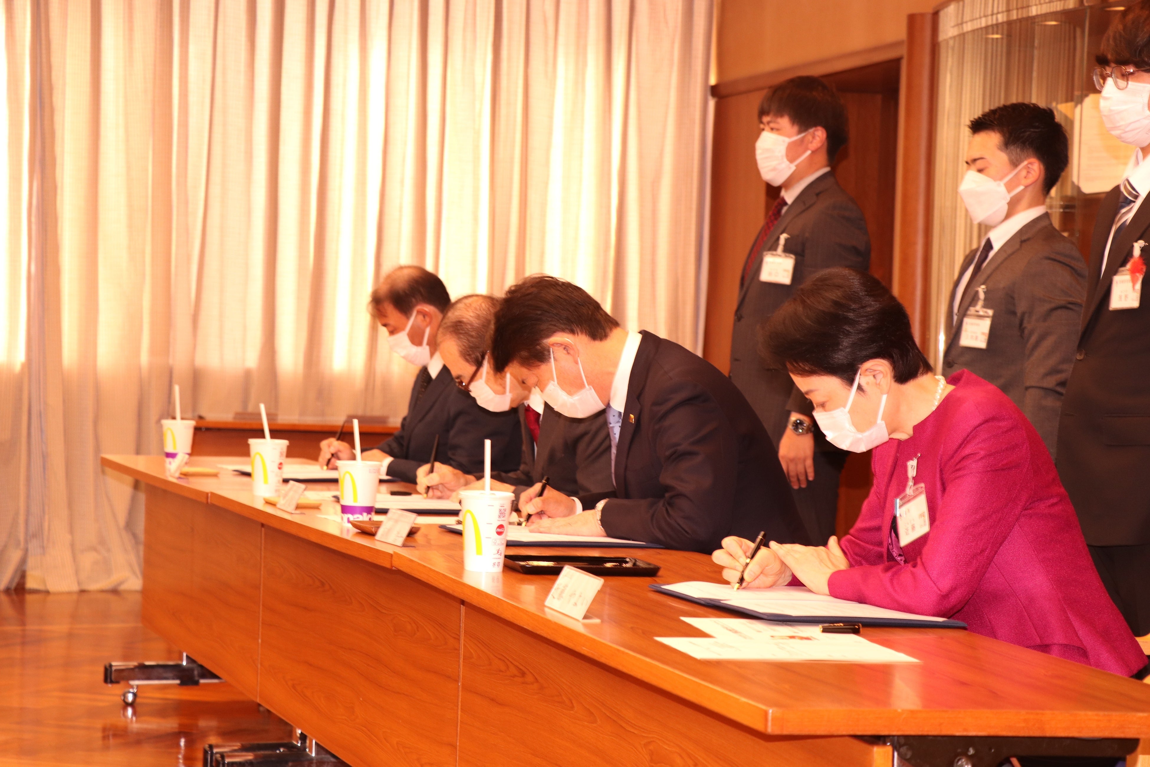 締結式では、近藤やよい足立区長、市川浩一 日本マクドナルド株式会社 東日本地区本部長、渡邊政弘 株式会社遊 代表取締役(日本マクドナルドフランチャイジー)、内田智浩 株式会社インライド 代表取締役(日本マクドナルドフランチャイジー)が出席し、それぞれ協定書に署名しました。