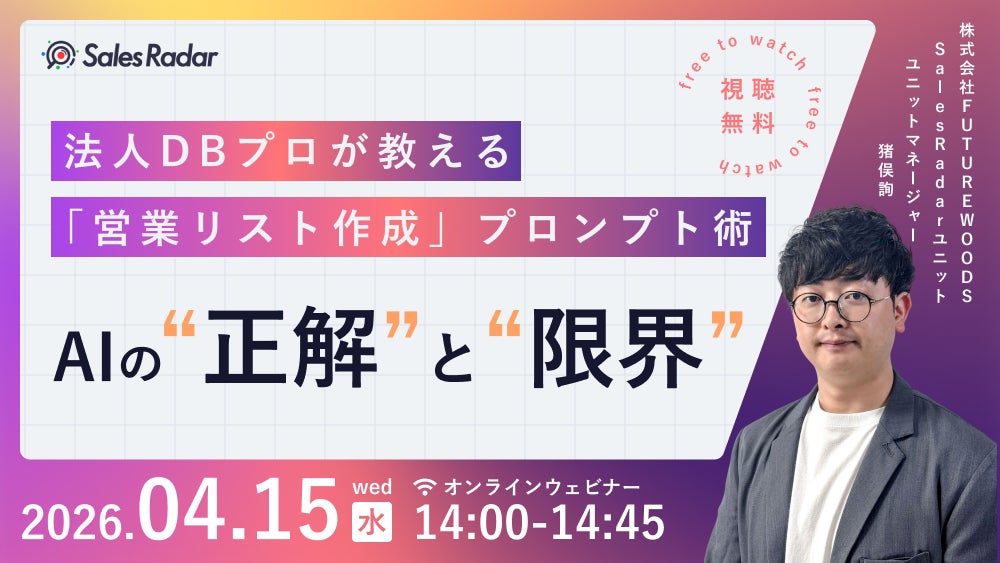 営業DXサービス「SalesRadar」を運営する株式会社FUTUREWOODS(東京都文京区、代表取締役:小浜勇人))は、2026年4月15日(水)14時からAIウェビナーを開催します。