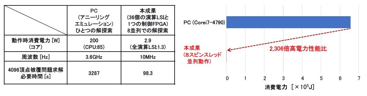 PCでの全結合イジングシステムを模したアニーリングエミュレーションと比較して、2,306 倍、コア部同士(CPUと演算チップ)での比較では2,186 倍の電力性能比を達成しました。