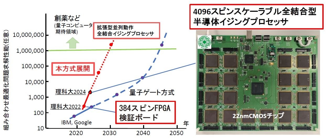東京理科大学工学部電気工学科の河原尊之教授の研究グループは、複数の22nm相補型金属酸化膜半導体(CMOS)チップで構成されたスケーラブルな全結合半導体イジングプロセッシングシステムを開発しました。PCでの全結合イジングシステムを模したアニーリングエミュレーションと比較して、2,306倍、コア部同士(CPUと演算チップ)での比較は2,186倍の電力性能比を達成しました。更に開発したシステムはスピンスレッドを用いた8並列の解探索を実現しており、高精度な探索が可能となります。