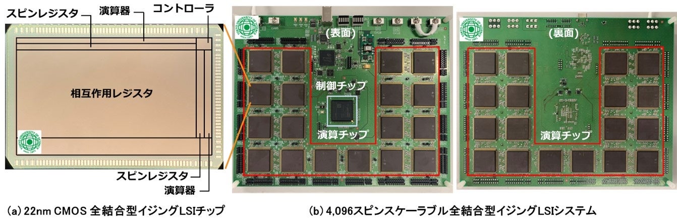 図1. 本研究で開発した22nm CMOS全結合型イジングLSIチップ(a)と、それらを結合した4,096スピンスケーラブル全結合型イジングLSIシステム(b)。