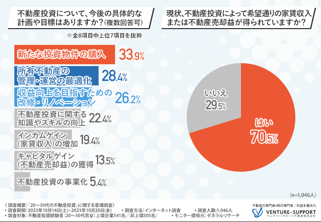 「希望通りの家賃収入または不動産売却益が得られている」と回答した人は7割に上る。今後の計画や目標は「新たな投資物件の購入」