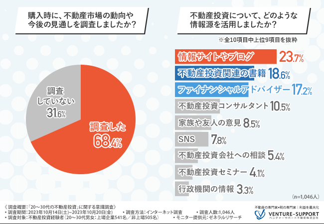 購入時に、不動産市場の動向や今後の見通しを調査した人は7割近くに上り、不動産投資に関して「情報サイトやブログ・書籍」の情報を活用している人が4割と多かった。