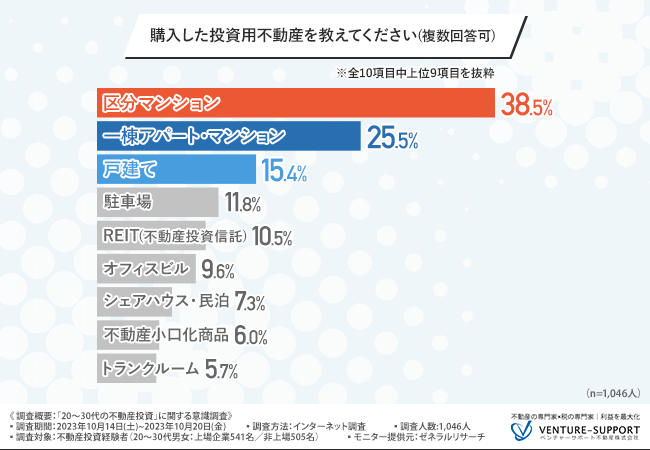 次に、「購入した投資用不動産を教えてください(複数回答可)」と質問したところ「区分マンション(38.5%)」「一棟アパート・マンション(25.5%)」「戸建て(15.4%)」「駐車場(11.8%)」「REIT(不動産投資信託)(10.5%)」「オフィスビル(9.6%)」「シェアハウス・民泊(7.3%)」「不動産小口化商品(6.0%)」「トランクルーム(5.7%)」という回答結果となった。