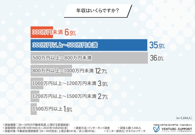 年収の内訳は、「300万円未満(6.9%)」「300万円以上~500万円未満(35.9%)」「500万円以上~800万円未満(36.0%)」「800万円以上~1000万円未満(12.7%)」「1000万円以上~1200万円未満(3.9%)」「1200万円以上~1500万円未満(2.7 %)」「1500万円以上(1.9%)」という回答結果となった。