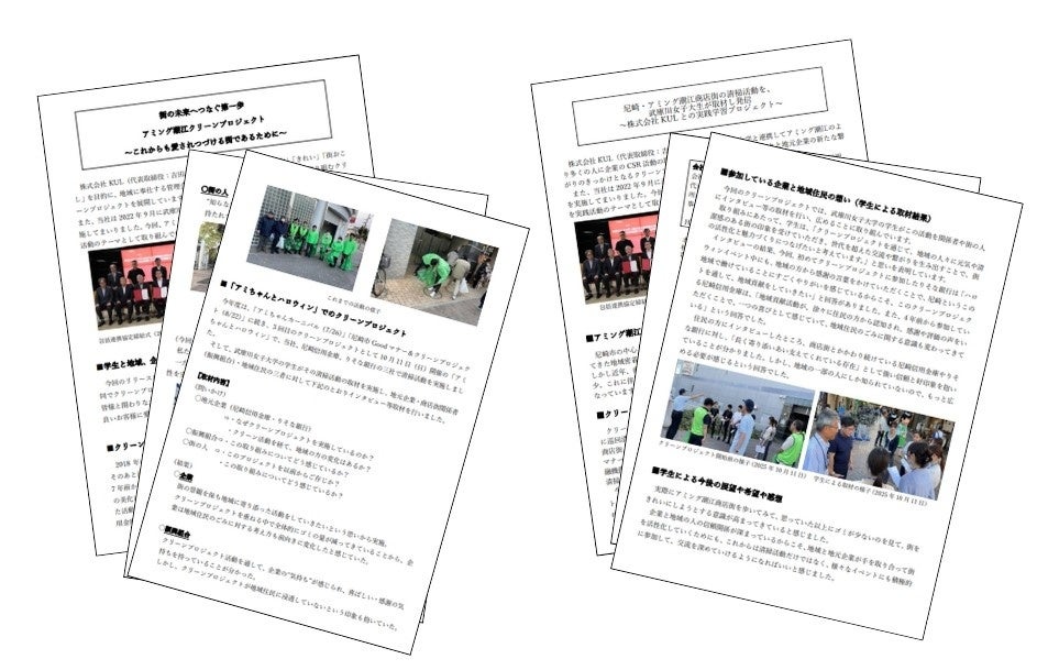 株式会社KUL(代表取締役:吉田滋)は武庫川女子大学経営学部と、課題解決型実践学習(PBL(Project-Based Learning)授業)を通じて、アミング潮江商店街(尼崎市)の活性化を目指すクリーンプロジェクトに取り組みました。2025年9月から11月にかけて実施されたこの取り組みでは、大学生が地元企業を訪問し、広報活動を行いながら、清掃活動を通じて地域活性化の可能性を探りました。
