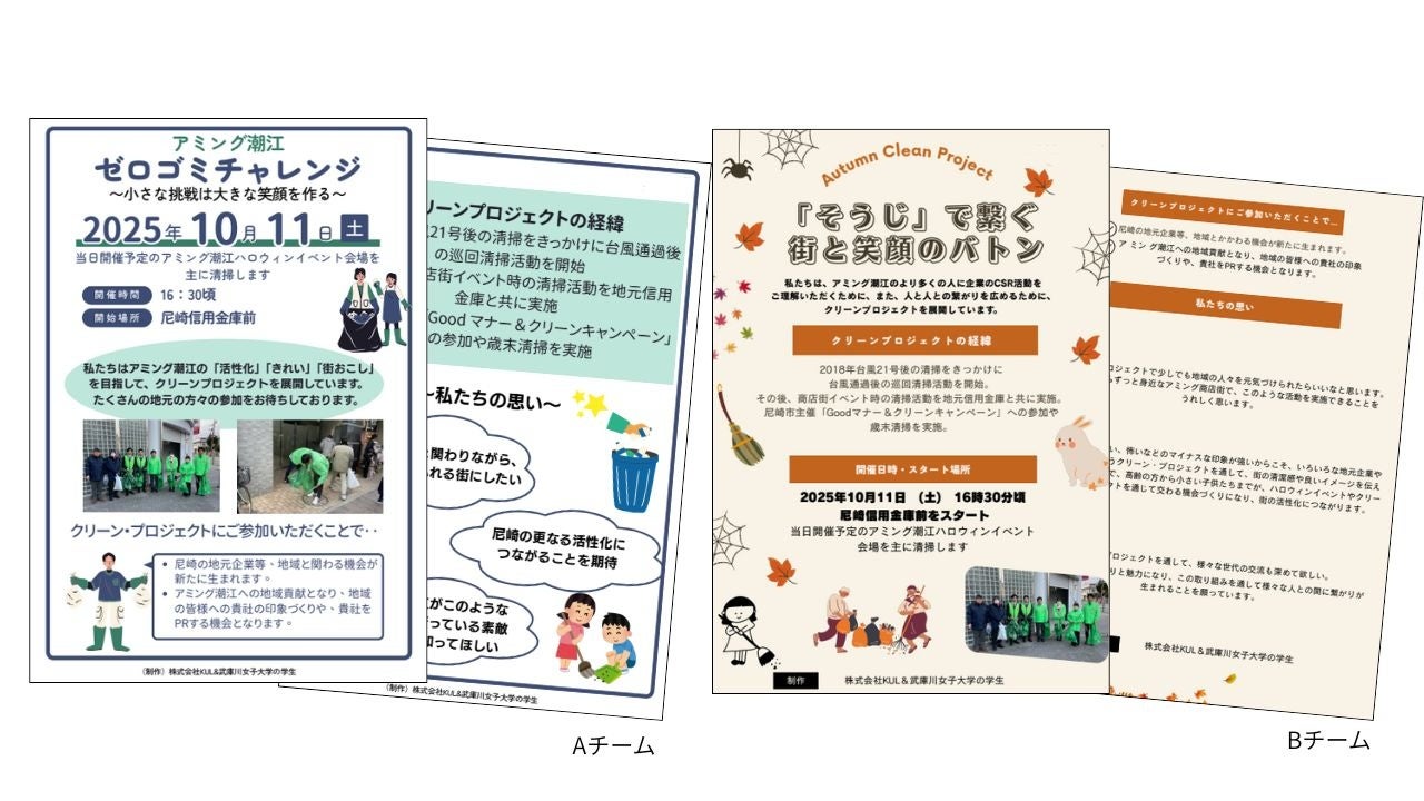 学生たちは地元企業への参加呼びかけのためのチラシを作成しました。Aチームは「アミング潮江ゼロゴミチャレンジ」、Bチームは「『そうじ』で繋ぐ街と笑顔のバトン」というキャッチコピーを掲げ、クリーンプロジェクトへの参加を呼びかけました。