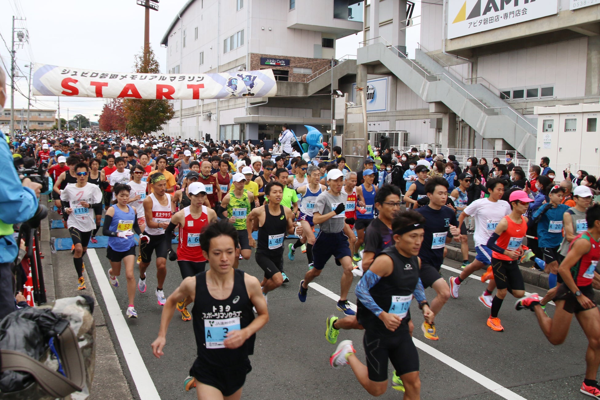 約5,000人のランナーが市内を駆け抜けます。ジュビロ磐田の選手も走ったりスターターを務めるなど、一緒に大会を盛り上げています。1998年から続く“スポーツのまち”磐田ならではの一大イベントです。