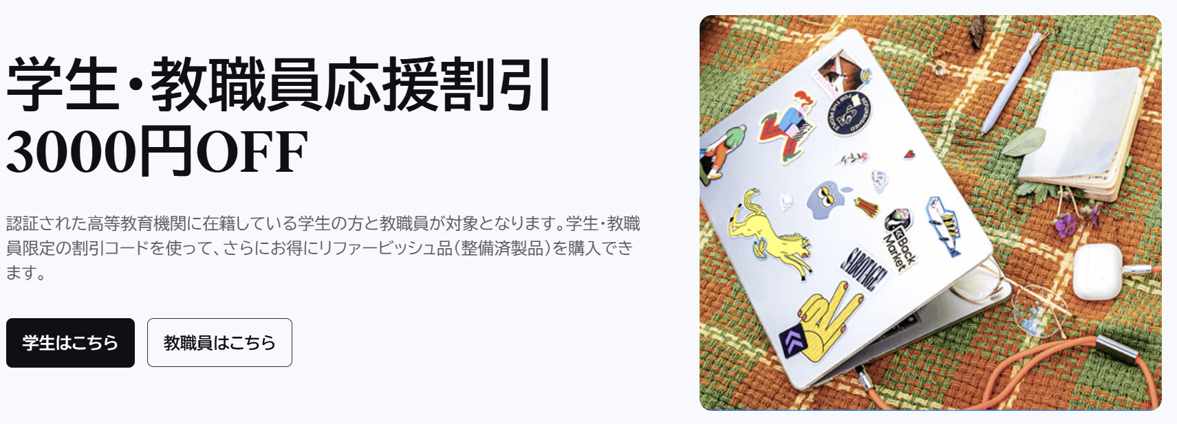 Back Marketの学生・教職員割引ページ:https://www.backmarket.co.jp/ja-jp/student-discount