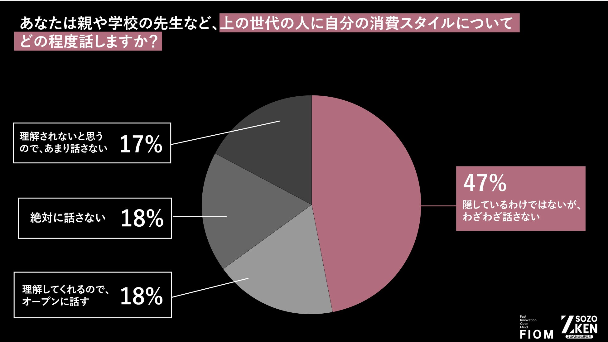 自身の消費スタイルについて上の世代に話すかという問いに対し、「隠しているわけではないが、わざわざ話さない」(47%)、「絶対に話さない」(18%)、「理解されないと思うので、あまり話さない」(17%)と、合計82%が大人には明かさないクローズドな世界で楽しんでいる実態が明らかになりました 。