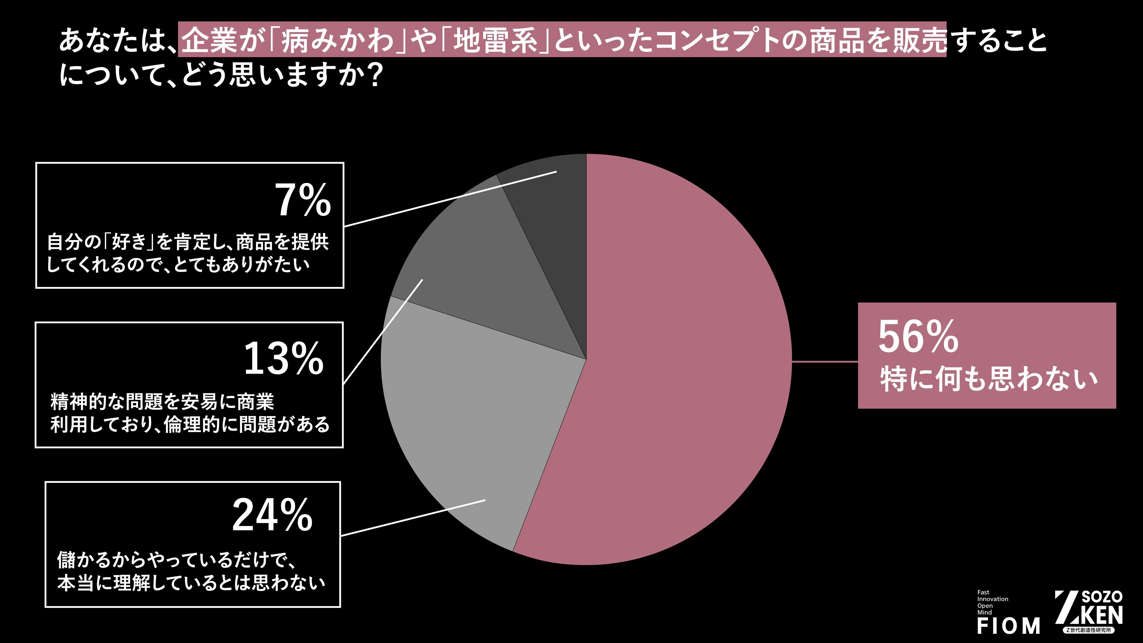 企業が「病みかわ」などのコンセプト商品を販売することについて、「儲かるからやっているだけで、本当に理解しているとは思わない」(24%)、「精神的な問題を安易に商業利用しており、倫理的に問題がある」(13%)と、上辺だけの参入に警戒感を示しています。