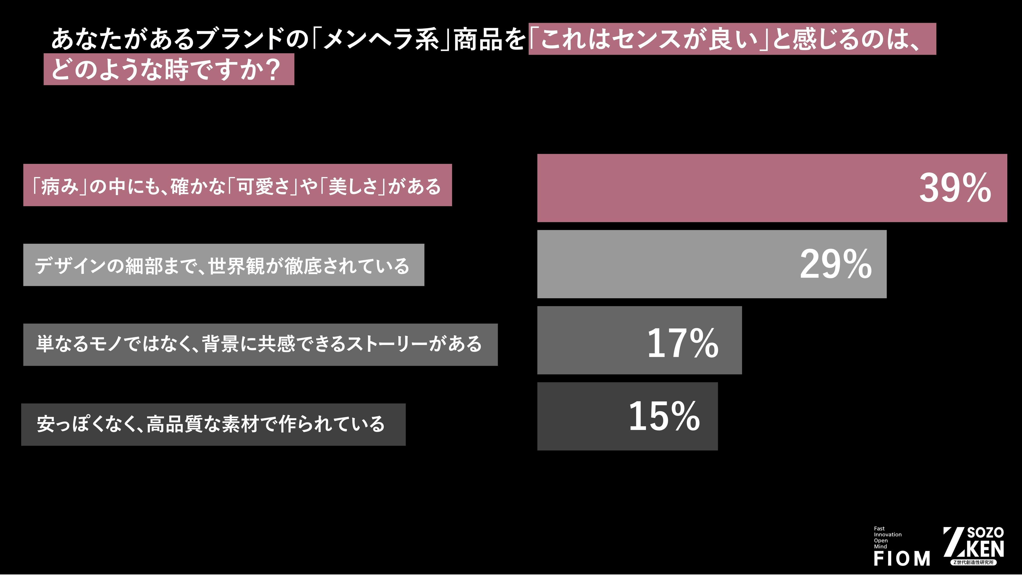 ブランドの商品を「センスが良い」と感じる理由は、「『病み』の中にも、確かな『可愛さ』や『美しさ』がある」(39%)が1位。次いで「デザインの細部まで、世界観が徹底されている」(29%)となりました。