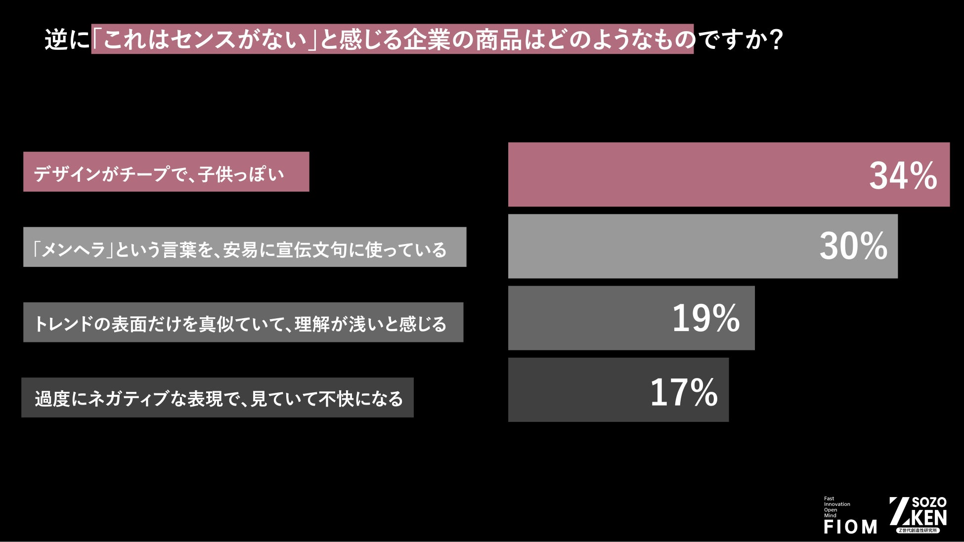 「センスがない」と感じる商品は、「デザインがチープで、子供っぽい」(34%)、「『メンヘラ』という言葉を、安易に宣伝文句に使っている」(30%)が上位を占めました。