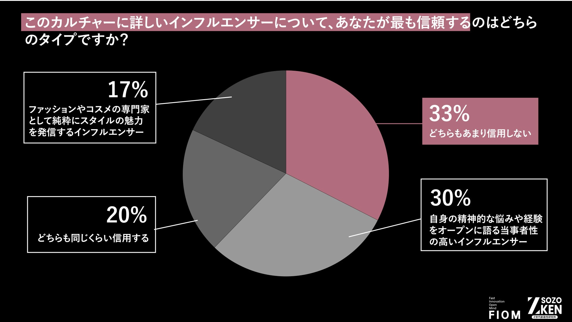 このカルチャーにおいて最も信頼するインフルエンサーは、「自身の精神的な悩みや経験をオープンに語る当事者性の高いインフルエンサー」(30%)がトップ。「ファッションやコスメの専門家」(17%)を上回りました。
