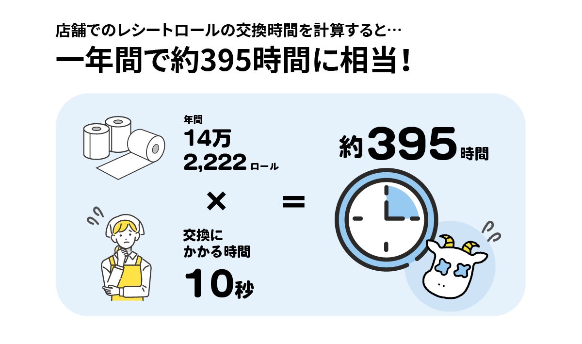 最後に、紙レシートロール数の換算値(14万2,222個)に、店舗での紙レシートロール1個の平均交換時間(10秒)を掛けると、1年間に削減した紙レシートロール交換時間は約395時間となります。コスト同様、店舗側における交換の手間は、人件費にも大きく影響していることが分かります。