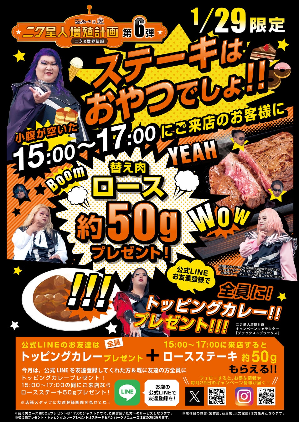 そんな思いから1月29日の15時〜17時に来店いただいた方限定で強制的に替え肉しちゃいます!