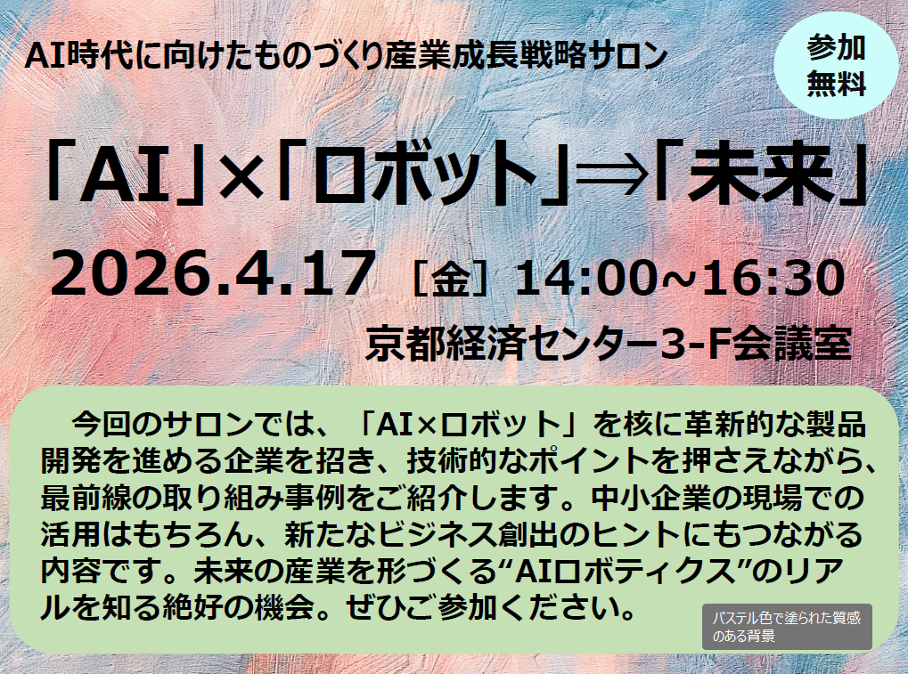 「AI時代に向けた京都ものづくり産業成長戦略サロン」は、AIや半導体などの先端技術を通じて地域産業の競争力強化を目指す、オール京都で運営・推進されるイベントです。産学公のネットワーク構築や新ビジネス創出につながる交流の場として、AIやロボットの進化がものづくり企業の現場にもたらす可能性や、そのヒントとなる実践事例が紹介されます。