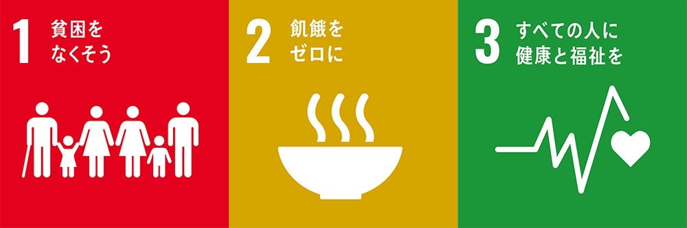 フードドライブの実施は「1.貧困をなくそう」「2.飢餓をゼロに」「3.すべての人に健康と福祉を」の3つの目標のゴール達成のために貢献します。