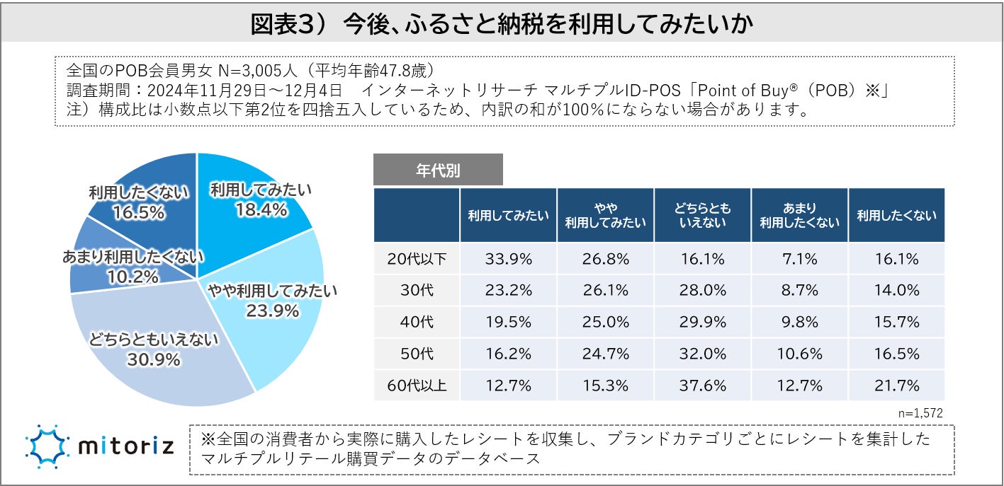 ふるさと納税を利用したことのない人の4割が「今後、利用してみたい」と回答し、若い年代ほど顕著