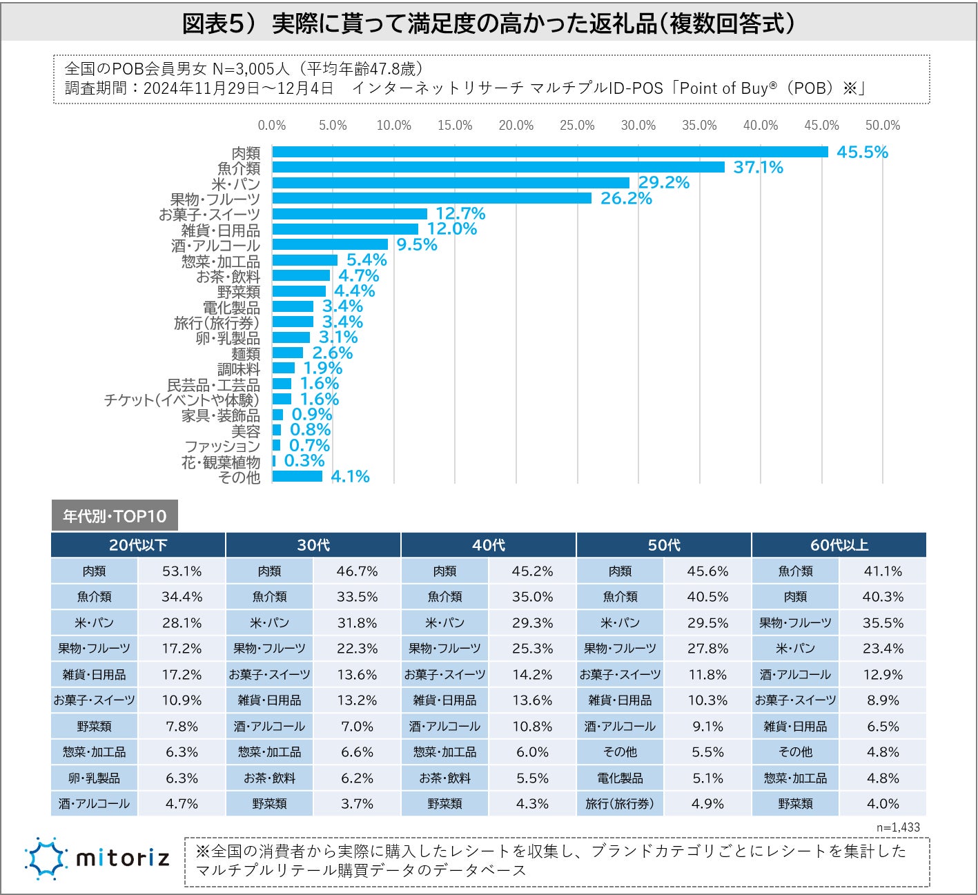満足度の高かった返礼品は全年代で「肉類」「魚介類」「米・パン」「果物・フルーツ」が上位に並ぶ