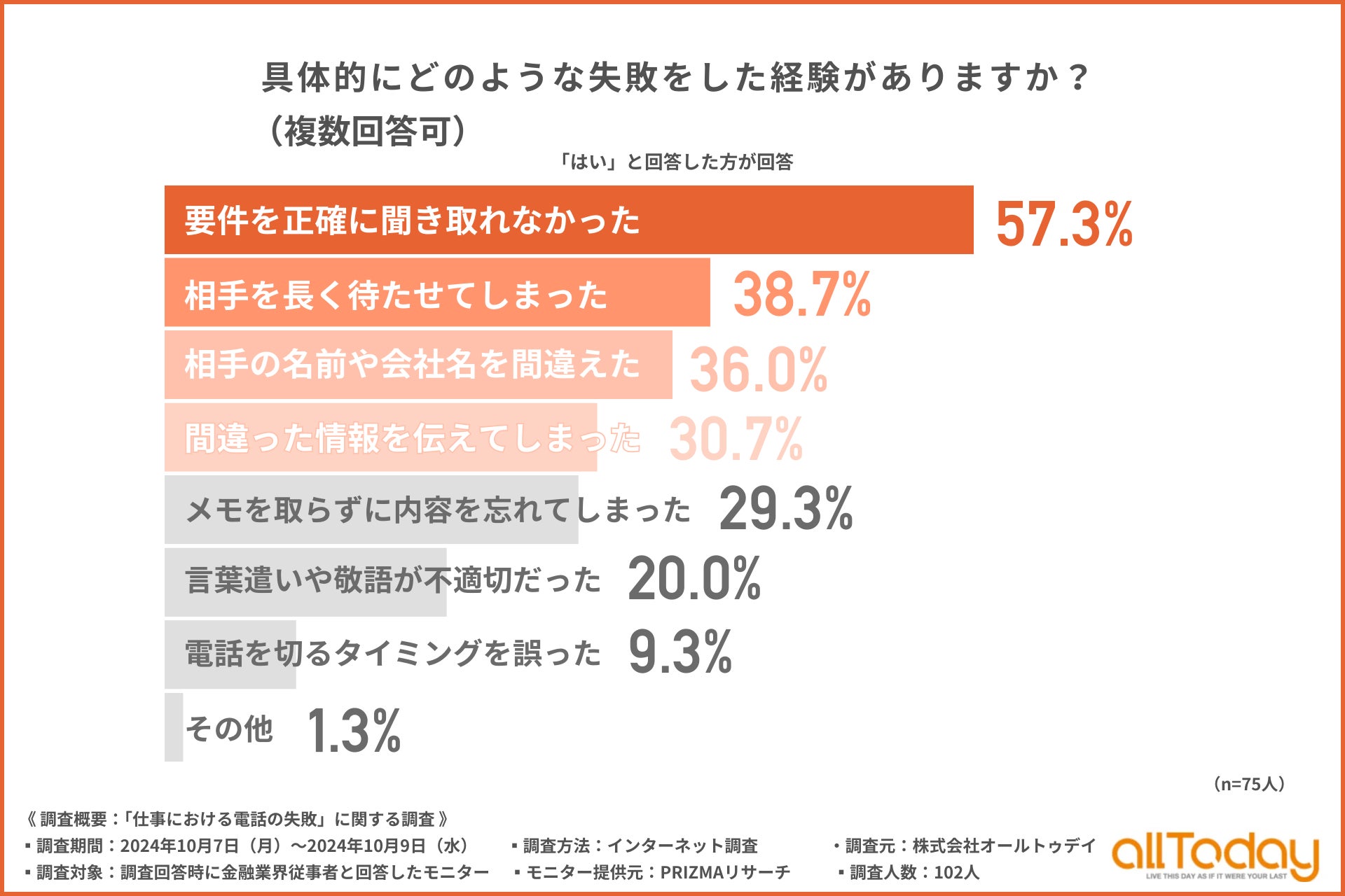 前の質問で「はい」と回答した方に、「具体的にどのような失敗をした経験がありますか?(複数回答可)」と質問したところ、『要件を正確に聞き取れなかった(57.3%)』と回答した方が最も多く、次いで『相手を長く待たせてしまった(38.7%)』『相手の名前や会社名を間違えた(36.0%)』『間違った情報を伝えてしまった(30.7%)』となりました。