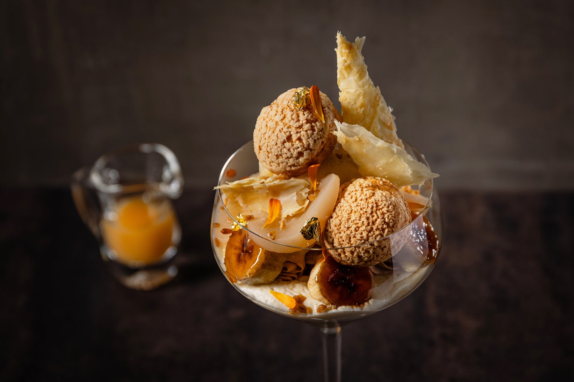 1840年ごろにパリのパティシエによって考案されたシュー生地とパイ生地にクリームを合わせた伝統的なフランス菓子「サントノーレ」にねっとりとしたバナナのパーツや生地、白桃のフレッシュで甘い果実感あるジュレとコンポートを合わせてパフェにリメイクしました。ザクザク、カリカリ、ふわふわと巡る食感にバナナと白桃のソースをかけて上品な香りにどこか馴染みある懐かしい味わいをお楽しみください。