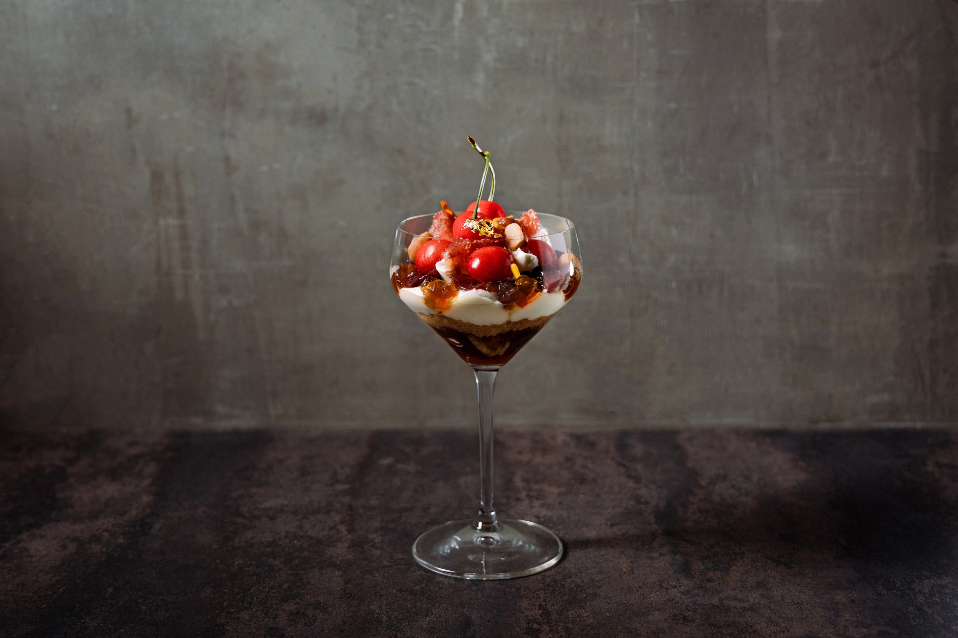 完全会員制パフェバー「Remake easy」から6月限定、佐藤錦とイチジク、和紅茶のハーモニーが織りなす果実感あふれる初夏のパフェ『佐藤錦とイチジクのチェリークランブルパフェ』が登場!