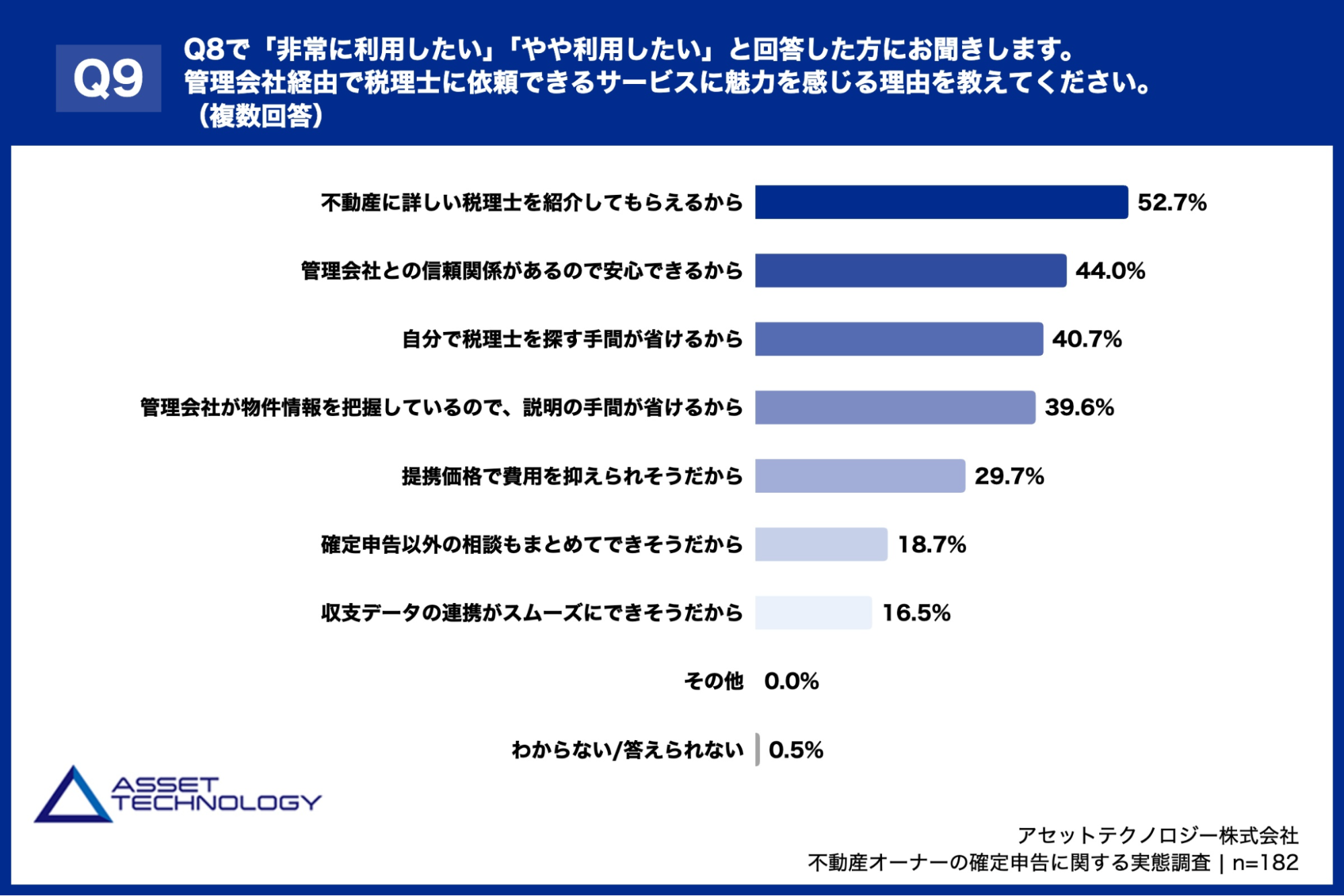 「Q9. Q8で「非常に利用したい」「やや利用したい」と回答した方にお聞きします。管理会社経由で税理士に依頼できるサービスに魅力を感じる理由を教えてください。(複数回答)」(n=182)と質問したところ、「不動産に詳しい税理士を紹介してもらえるから」が52.7%、「管理会社との信頼関係があるので安心できるから」が44.0%、「自分で税理士を探す手間が省けるから」が40.7%という回答となりました。