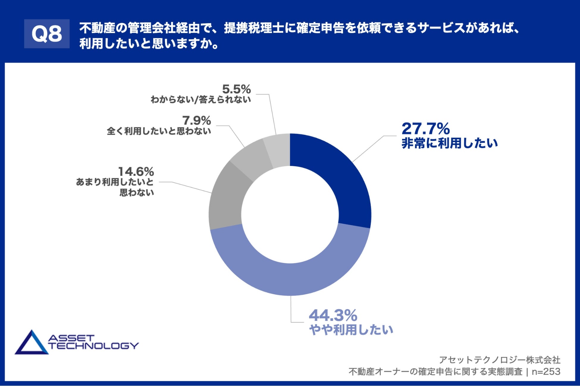 「Q8. 不動産の管理会社経由で、提携税理士に確定申告を依頼できるサービスがあれば、利用したいと思いますか。」(n=253)と質問したところ、「非常に利用したい」が27.7%、「やや利用したい」が44.3%という回答となりました。
