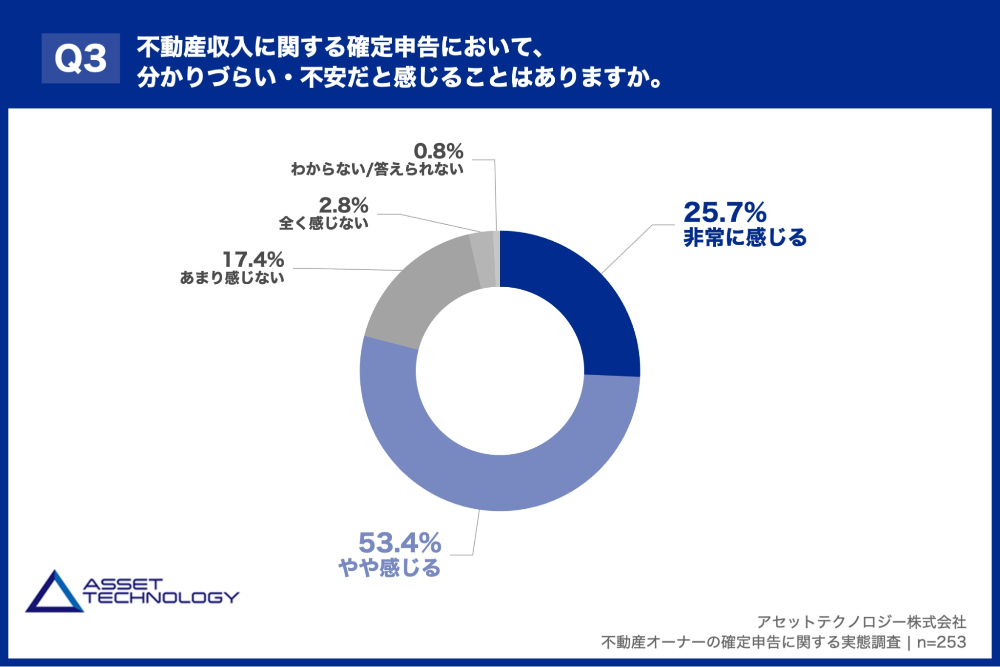 「Q3. 不動産収入に関する確定申告において、分かりづらい・不安だと感じることはありますか。」(n=253)と質問したところ、「非常に感じる」が25.7%、「やや感じる」が53.4%という回答となりました。
