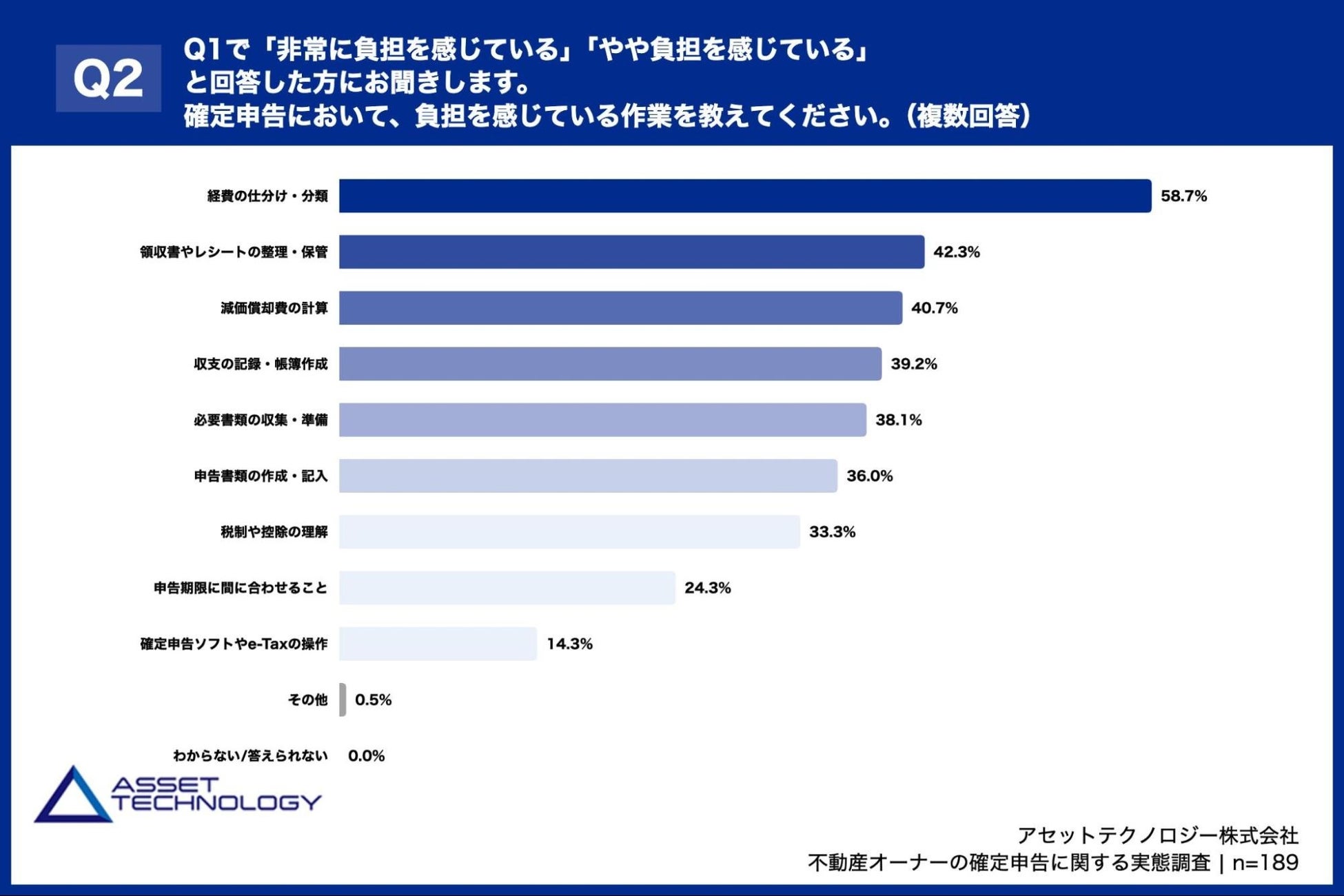 「Q2. Q1で「非常に負担を感じている」「やや負担を感じている」と回答した方にお聞きします。確定申告において、負担を感じている作業を教えてください。(複数回答)」(n=189)と質問したところ、「経費の仕分け・分類」が58.7%、「領収書やレシートの整理・保管」が42.3%、「減価償却費の計算」が40.7%という回答となりました。