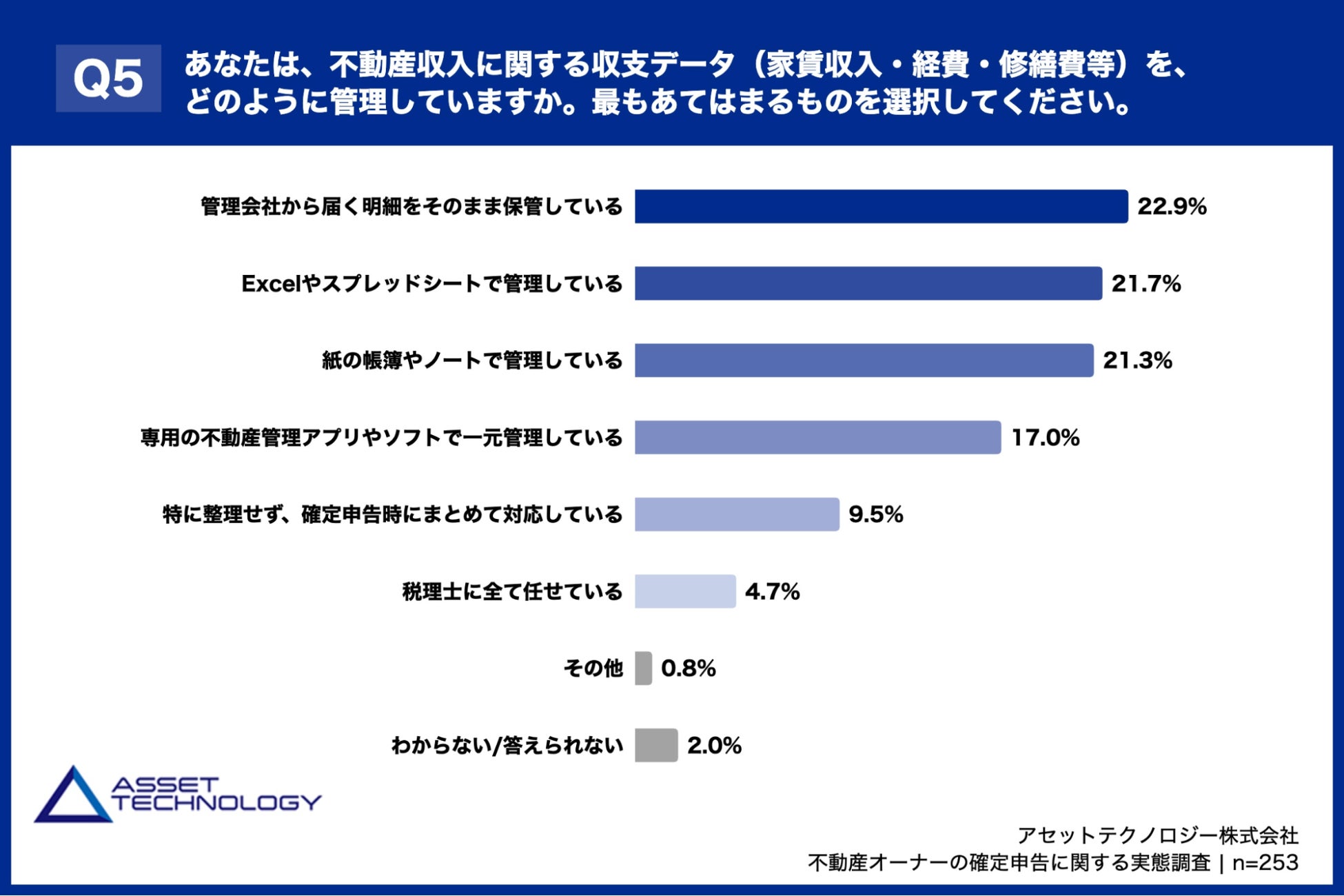 「Q5. あなたは、不動産収入に関する収支データ(家賃収入・経費・修繕費等)を、どのように管理していますか。最もあてはまるものを選択してください。」(n=253)と質問したところ、「管理会社から届く明細をそのまま保管している」が22.9%、「Excelやスプレッドシートで管理している」が21.7%、「紙の帳簿やノートで管理している」が21.3%という回答となりました。