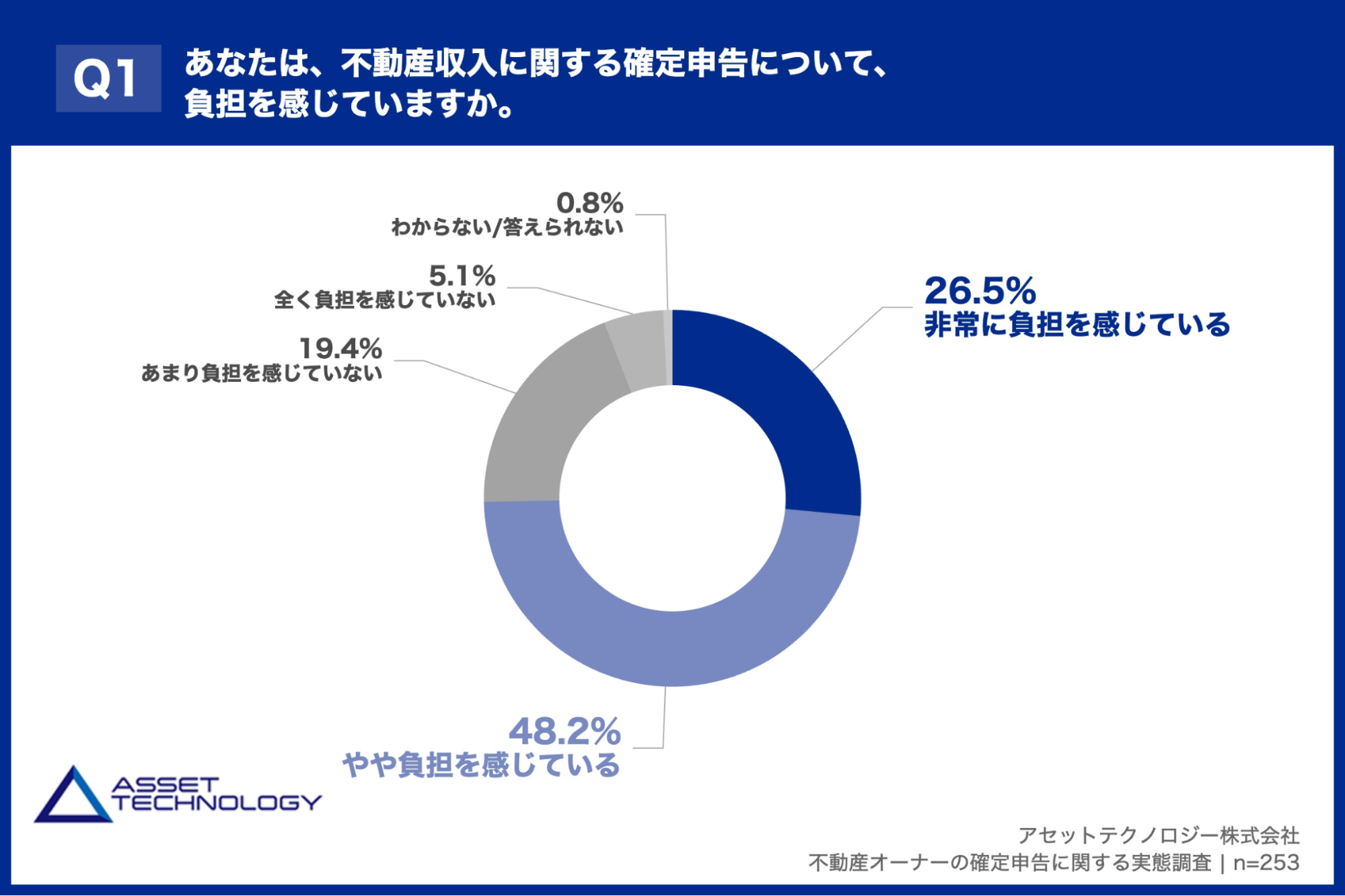 「Q1. あなたは、不動産収入に関する確定申告について、負担を感じていますか。」(n=253)と質問したところ、「非常に負担を感じている」が26.5%、「やや負担を感じている」が48.2%という回答となりました。