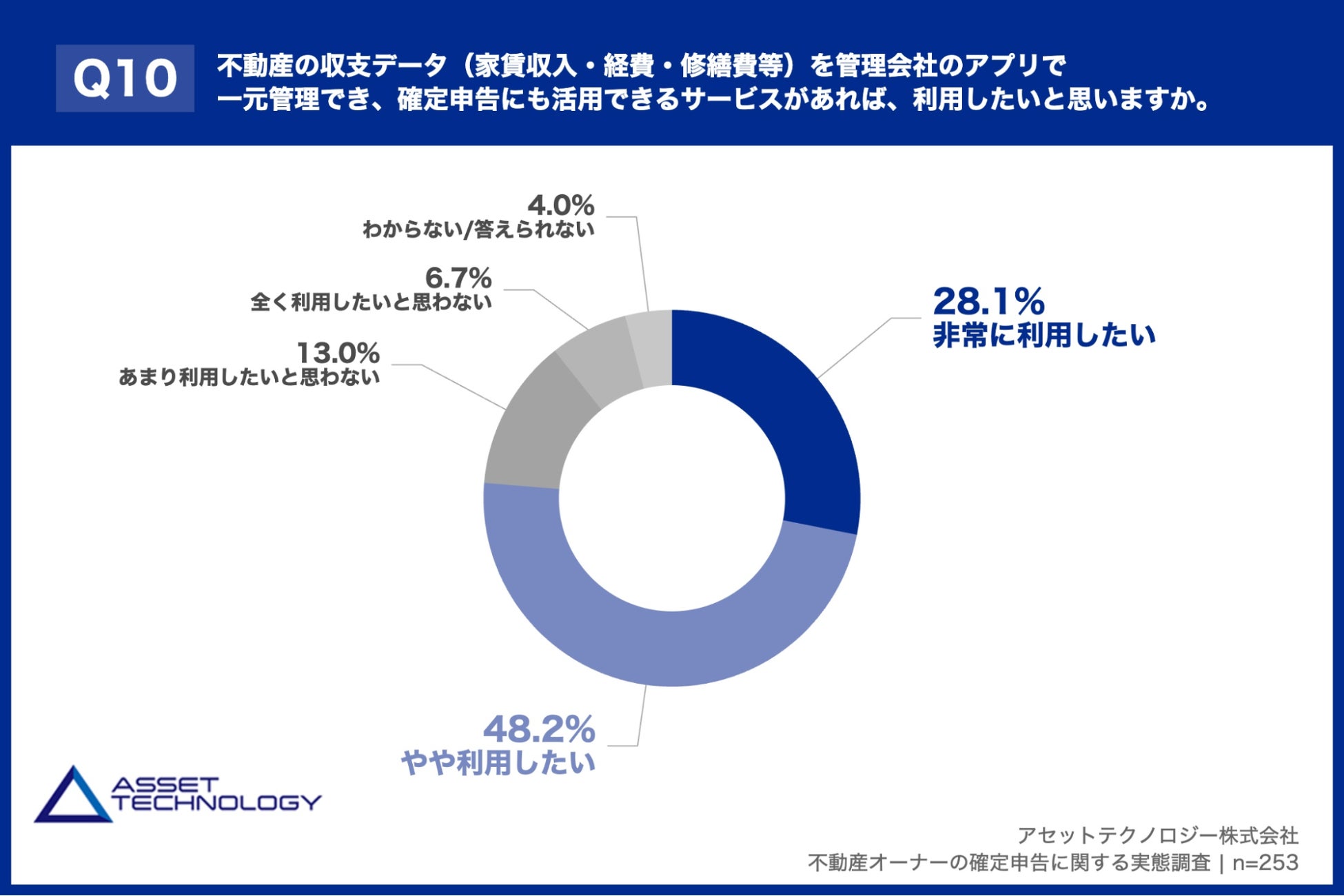 「Q10. 不動産の収支データ(家賃収入・経費・修繕費等)を管理会社のアプリで一元管理でき、確定申告にも活用できるサービスがあれば、利用したいと思いますか。」(n=253)と質問したところ、「非常に利用したい」が28.1%、「やや利用したい」が48.2%という回答となりました。